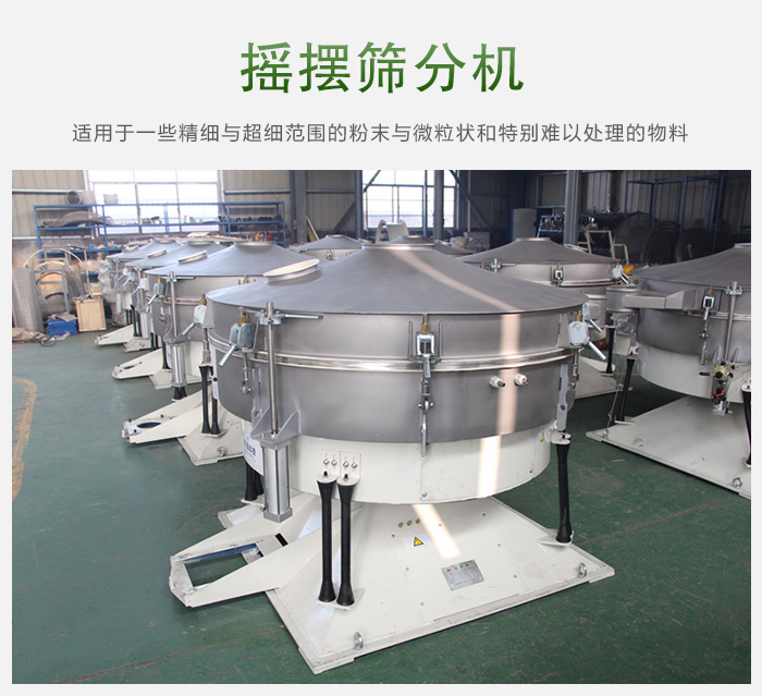搖擺篩分機是由普通電機傳動作基本的回轉運動與人工篩分相類似,使物料在篩網上形成水平與拋擲三維翻滾運動,從中心到外緣在整個篩面上均勻分散,從而以螺旋運動往軸向傳播。調整擺振體上面的經向角和切向角可改變物料在網面上的運動軌跡!