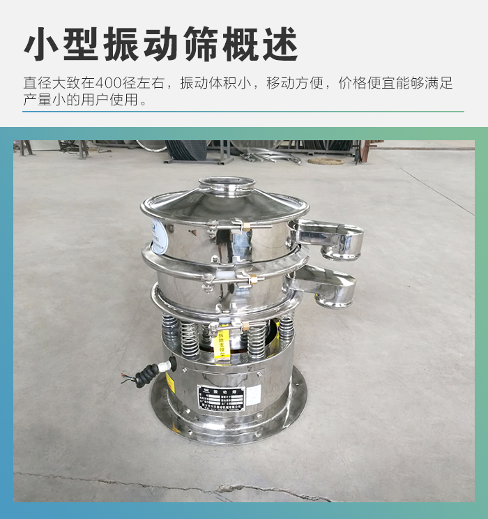 該產品的直徑大致在400徑左右,振動體積小,移動方便,價格便宜能夠滿足產量小的用戶使用,可篩分0-400目的物料篩分。不管是液態還是漿態的0-600目都是可以過濾的。